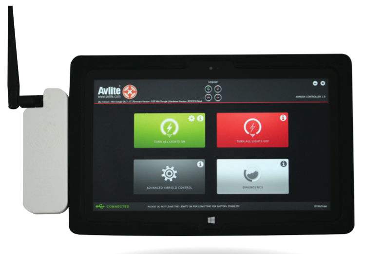 Le périphérique USB peut être utilisé avec les tablettes * fonctionnant sous Windows 8.1 ou supérieur, et permet le contrôle sans fil des lumières de l'aérodrome ou de l'héliport sur un réseau maillé 2,4 GHz. L'interface propriétaire de la tablette fournit une plate-forme intuitive et facile à utiliser, qui donne aux opérateurs un contrôle total sur une multitude de messages de commande et de configuration.